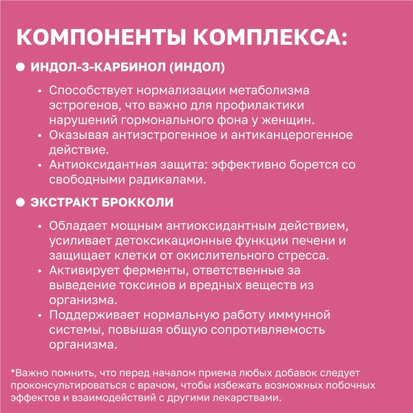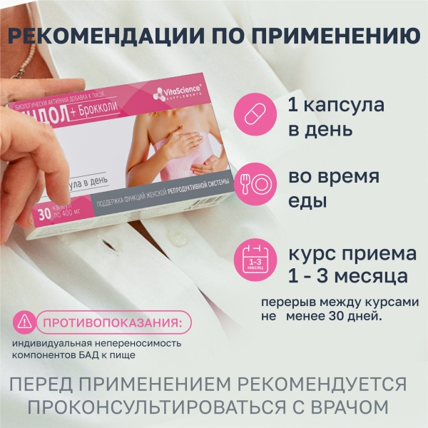 Рекомендуется женщинам старше 18 лет в качестве дополнительного источника индол-3-карбинола; для поддержания функций женской репродуктивной системы.