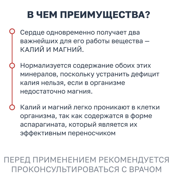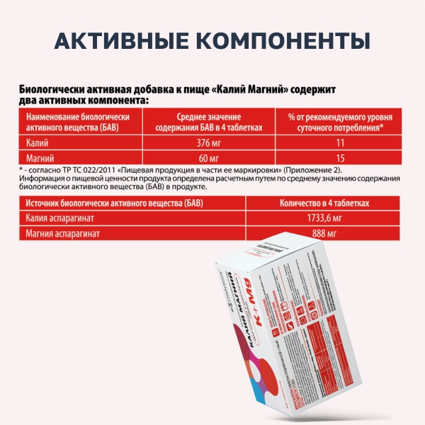 Калия аспарагинат; носитель: микрокристаллическая целлюлоза Е460 (i); магния аспарагинат; антислёживающий агент: тальк Е553 (iii); пленкообразователь: гидроксипропилметилцеллюлоза Е464; носитель: мальтодекстрин; краситель: диоксид титана Е171; влагоудерживающий агент: пропиленгликоль Е1520; антислёживающий агент: диоксид кремния аморфный Е551; антислёживающий агент: магния стеарат Е470; носитель: кроскарамеллоза натрия Е468; антислёживающий агент: кислота стеариновая Е570.