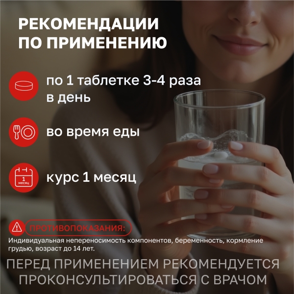 Взрослым, по 1 таблетке 3–4 раза в день во время еды.