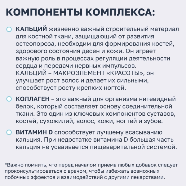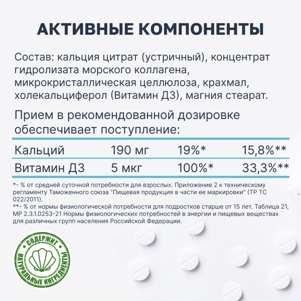 Кальция цитрат (устричный), концентрат гидролизата морского коллагена, микрокристаллическая целлюлоза (носитель), крахмал (носитель), холекальциферол (витамин Д3), магния стеарат (агент антислеживающий).
