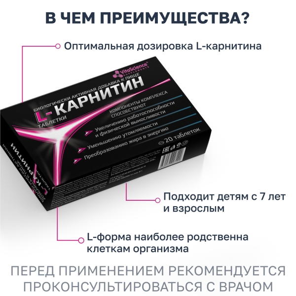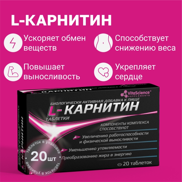 ✓ Купить Vitascience L-карнитин таблетки 400мг, №20 можно на сайте, в мобильном приложении и в аптеках Вита