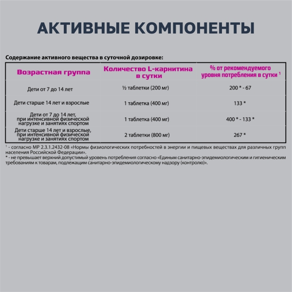 L-карнитина тартрат; носитель: микрокристаллическая целлюлоза Е460 (i); носитель: гидроксипропилметилцеллюлоза Е464; антислёживающий агент: диоксид кремния аморфный Е551; носитель: кроскарамеллоза натрия Е468; носители: кислота стеариновая Е570, мальтодекстрин; краситель: диоксид титана Е171; антислёживающий агент: тальк Е553 (iii); антислёживающий агент: магния стеарат Е470; влагоудерживающий агент: пропиленгликоль Е1520.