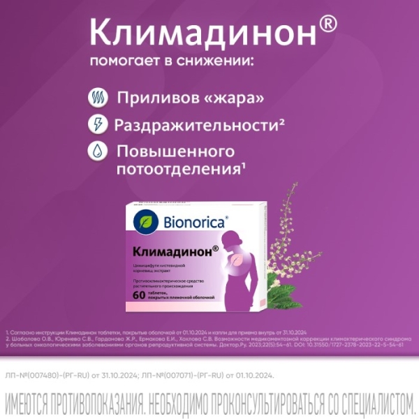 Препарат Климадинон® показан для облегчения симптомов менопаузы, таких как «приливы» жара и повышенное потоотделение.