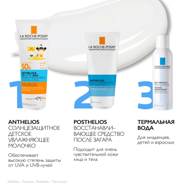 Солнцезащитное средство для лица и тела для детей с 3 лет. Защита от широкого спектра УФ-лучей: лучи типа В, типа А и ультрадлинные лучи типа А. UV-фильтр: Mexoryl 400 защищает от ультрадлинных UVA-лучей (380-400 нм), которые незаметны, повреждают кожу на глубоком клеточном уровне и составляют 30% УФ-лучей, воздействующих на кожу круглый год.