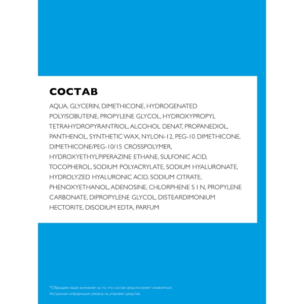 AQUA • GLYCERIN • DIMETHICONE • HYDROGENATED POLYISOBUTENE • PROPYLENE GLYCOL • HYDROXYPROPYL TETRAHYDROPYRANTRIOL • ALCOHOL DENAT. • PROPANEDIOL • PANTHENOL • SYNTHETIC WAX • NYLON-12 • PEG-10 DIMETHICONE • DIMETHICONE/PEG-10/15 CROSSPOLYMER • HYDROXYETHYLPIPERAZINE ETHANE SULFONIC ACID • TOCOPHEROL • SODIUM POLYACRYLATE • SODIUM HYALURONATE • HYDROLYZED HYALURONIC ACID • SODIUM CITRATE • PHENOXYETHANOL • ADENOSINE • CHLORPHENE S I N • PROPYLENE CARBONATE • DIPROPYLENE GLYCOL • DISTEARDIMONIUM HECTORITE • DISODIUM EDTA • PARFUM. (CODE F.I.L.: C213954/1).