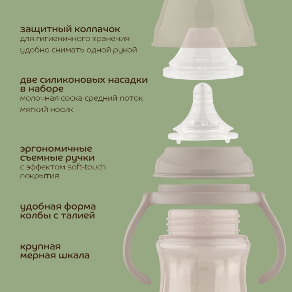 Поильник-бутылочка оснащен соской молочной и мягким силиконовым носиком. Меняйте соску на носик по мере взросления ребенка. Благодаря особой форме носика поильник является непроливаемым. Съемные ручки эргономичной формы удобны для мамы и малыша. Поильник легкий и не бьющийся. Объем в 300 мл оптимален в использовании. Мерная шкала позволяет контролировать количество жидкости. Колпачок защищает соску и носик от загрязнений, что позволяет брать поильник-бутылочку на прогулку. Изготовлен из безопасных качественных материалов. Трендовый дизайн и модная цветовая гамма подойдут как мальчикам, так и девочкам.