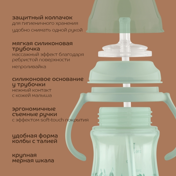 Поильник-непроливайка оснащен мягкой силиконовой трубочкой. Подходит для детей, которые уже умеют пить самостоятельно. Мягкая силиконовая трубочка не оказывает травматичного воздействия на чувствительные десны и зубки ребенка. Съемные ручки эргономичной формы удобны для мамы и малыша. Поильник легкий и не бьющийся. Объем в 300 мл оптимален в использовании. Мерная шкала позволяет контролировать количество жидкости. Колпачок защищает трубочку от загрязнений, что позволяет брать поильник на прогулку. Изготовлен из безопасных качественных материалов. Трендовый дизайн и модная цветовая гамма подойдут как мальчикам, так и девочкам.