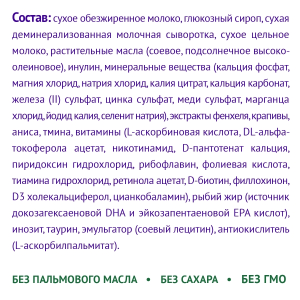 сухое обезжиренное молоко, глюкозный сироп, сухая деминерализованная молочная сыворотка, сухое цельное молоко, растительные масла (соевое, подсолнечное высокоолеиновое), инулин, минеральные вещества (фосфат кальция, хлорид магния, хлорид натрия, цитрат калия, карбонат кальция, сульфат железа, сульфат цинка, сульфат меди, хлорид марганца, йодид калия, селенит натрия), экстракты фенхеля, крапивы, аниса, тмина, витамины (аскорбиновая кислота, токоферола ацетат, никотинамид, D-пантотенат кальция, пиридоксина гидрохлорид, рибофлавин, фолиевая кислота, тиамина гидрохлорид, ретинола ацетат, D-биотин, филлохинон, холекальциферол, цианокобаламин), рыбий жир (источник докозагексаеновой DHA и эйкозапентаеновой EPA кислот), инозит, таурин, эмульгатор (соевый лецитин), антиокислитель (L-аскорбилпальмитат)