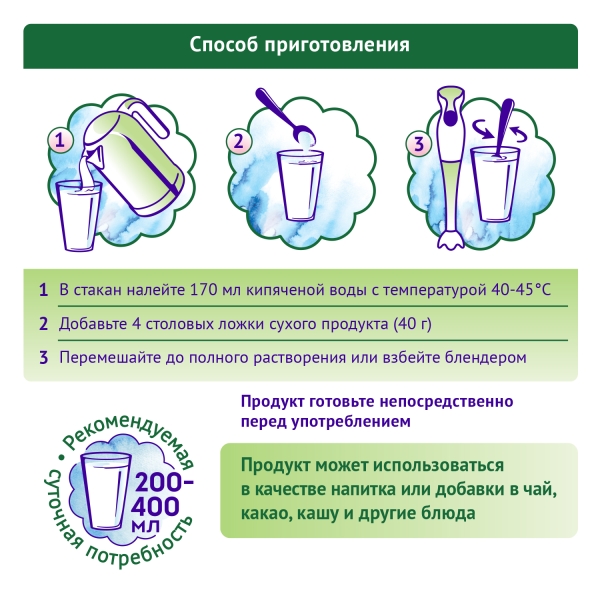 •    Добавьте 4 столовых ложки сухого продукта (40г)