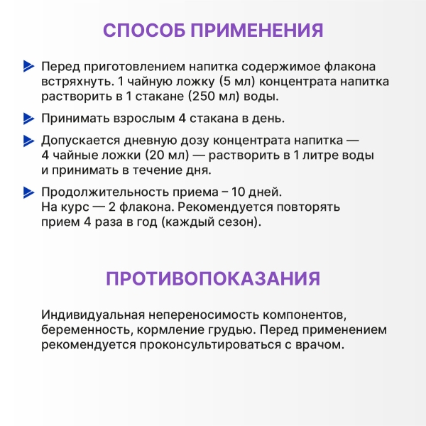 Перед приготовлением напитка содержимое флакона встряхнуть. 1 чайную ложку (5 мл) концентрата напитка растворить в 1 стакане (250 мл) воды. Принимать взрослым 4 стакана в день. Допускается дневную дозу концентрата напитка – 4 чайные ложки (20 мл) – растворить в 1 литре воды и принимать в течение дня.
