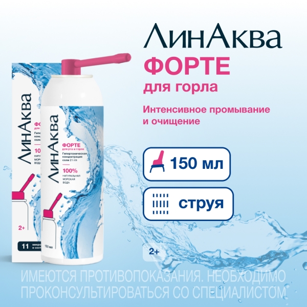 Область применения – оториноларингология. Средство применяется с лечебными, профилактическими и гигиеническими целями для очищения, снятия раздражения и защиты слизистой оболочки рта и горла. ЛинАква форте для рта и горла предназначено для ежедневного использования для детей с 2-х лет и взрослых, посредством промывания и орошения слизистой полости рта и горла.