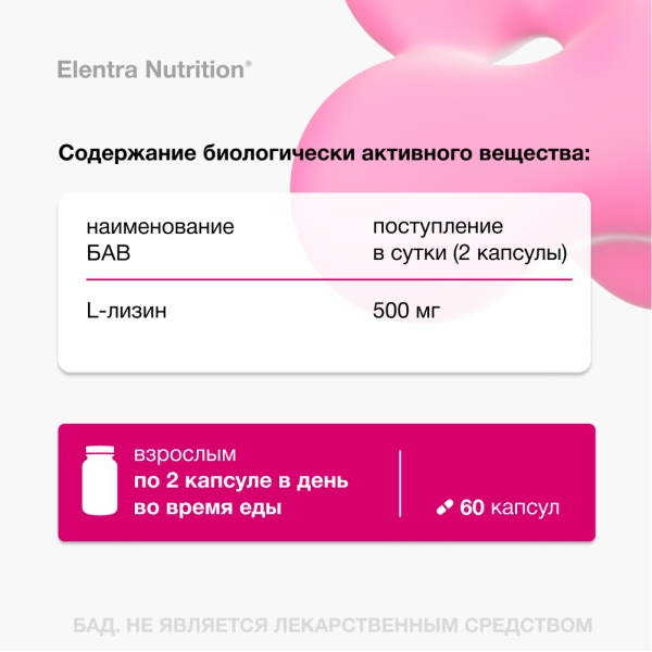 ✓ Цена на Elentra Nutrition L-Лизин капсулы, №60 указана на сайте и в мобильном приложении