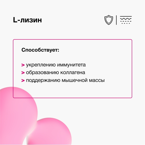 L-лизина гидрохлорид. капсула из гидроксипропилметил-целлюлозы (Е464, носитель), стеариновая кислота (Е570, носитель) кремния диоксид (Е551, агент антислеживающий).