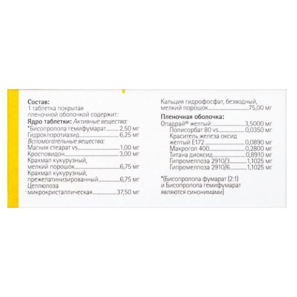 Начальная доза соответствует 1 таблетке, содержащей 2,5 мг бисопролола + 6,25 мг гидрохлоротиазида 1 раз в сутки.