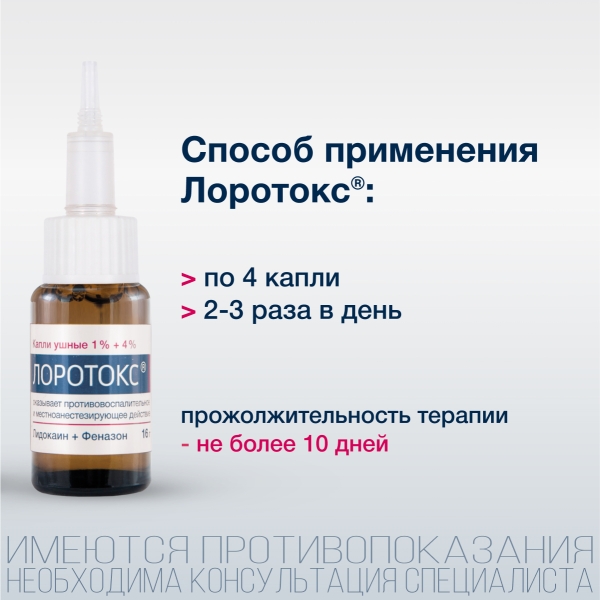 В настоящее время информация о взаимодействии с другими лекарственными средствами отсутствует. Особые указания Продолжительность применения препарата Лоротокс® не более 10 дней, после чего следует пересмотреть назначенное лечение. При использовании препарата Лоротокс® в сочетании с другими ушными каплями необходимо сохранять интервал минимум в 30 минут между закапываниями. Информация для спортсменов: препарат содержит активный компонент, способный дать положительную реакцию при допинг-контроле. Внимательно прочтите инструкцию перед тем, как начать применение препарата. Сохраните инструкцию, она может понадобиться вновь. Если у Вас возникли вопросы, обратитесь к врачу.
