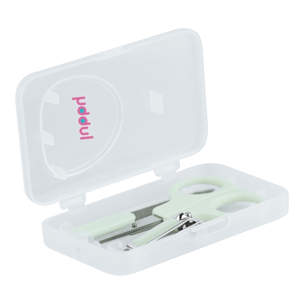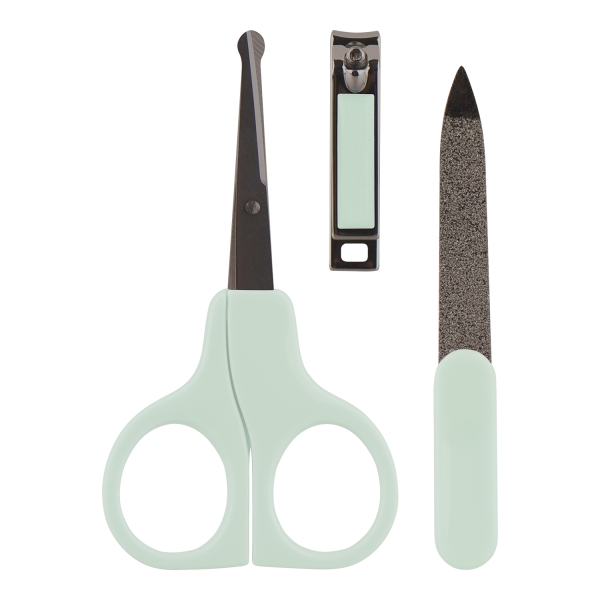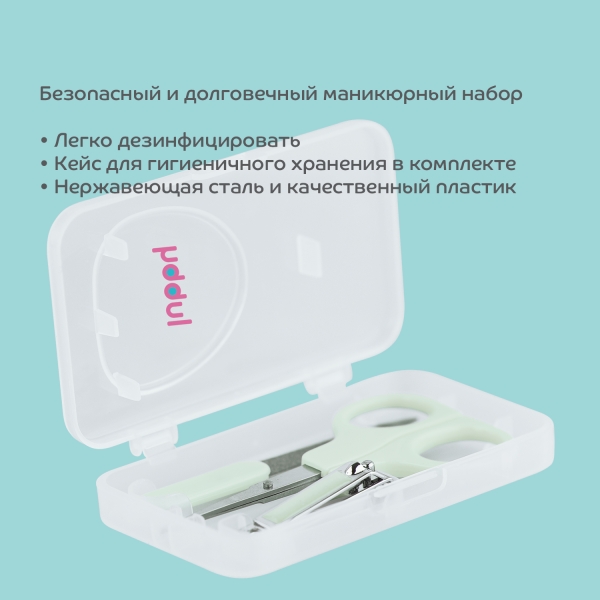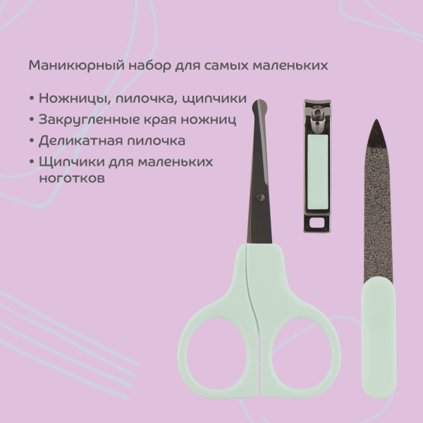 В маникюрном наборе есть все необходимое для ухода за ногтями ребенка - щипчики, пилочка и ножнички с закругленными кончиками.