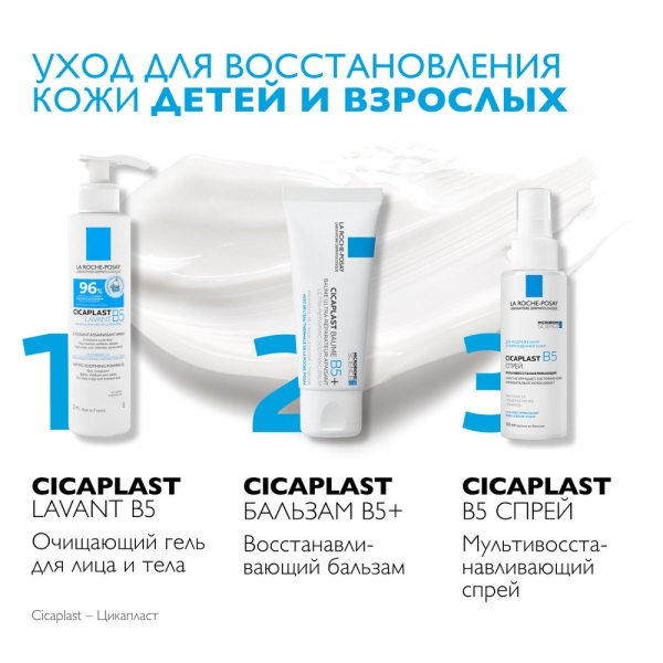 Новая улучшенная* формула бальзама Cicaplast B5+ вдохновлена наукой о микробиоме и включает Трибиому – уникальный комплекс пребиотиков из молочного фермента, сахаров и растительного экстракта, Пантенол 5% и Мадекассосид для моментального успокоения кожи и восстановления ее барьера, а также комплекс с признанными антибактериальными свойствами Цинк+Марганец.