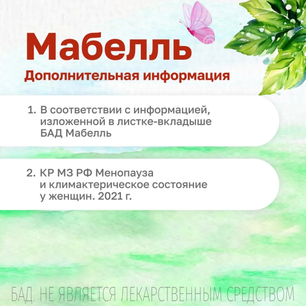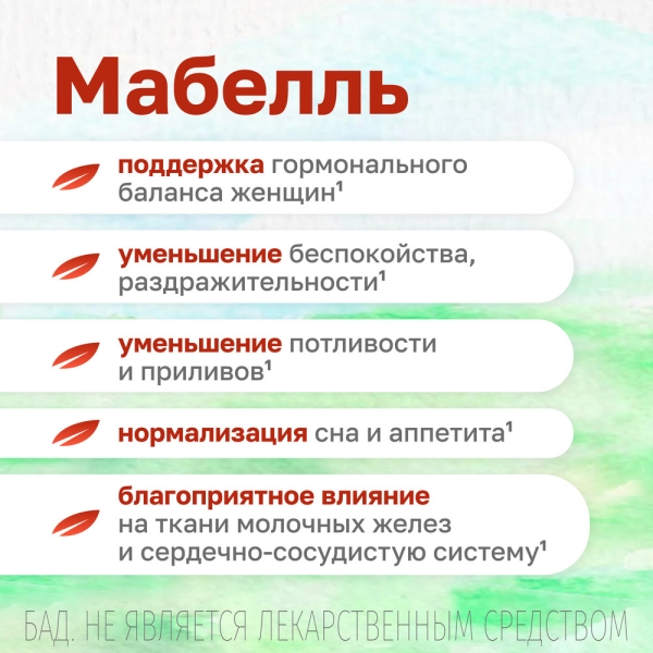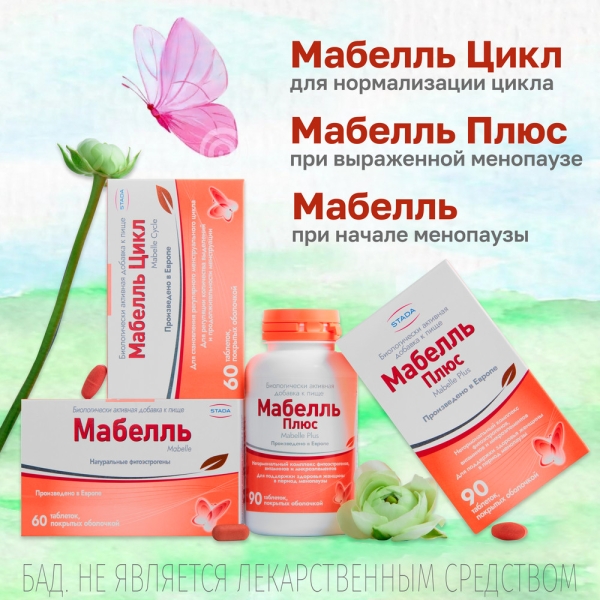 Комплекс Мабелль Mabelle (далее Мабелль) – это негормональное растительное средство, разработанное специально для женщин с учетом их специфических потребностей во время гормональных изменений – менопаузального перехода. Каждая женщина проходит в своей жизни биологический этап, который связан с различными неприятными проявлениями, вызванными снижением уровня женских половых гормонов – эстрогенов. Мабелль может служить дополнительным источником изофлавонов и флаволигнанов, а также способствовать повышению антиоксидантной защиты организма, поддержанию углеводного, липидного обменов и гормонального баланса женщин.