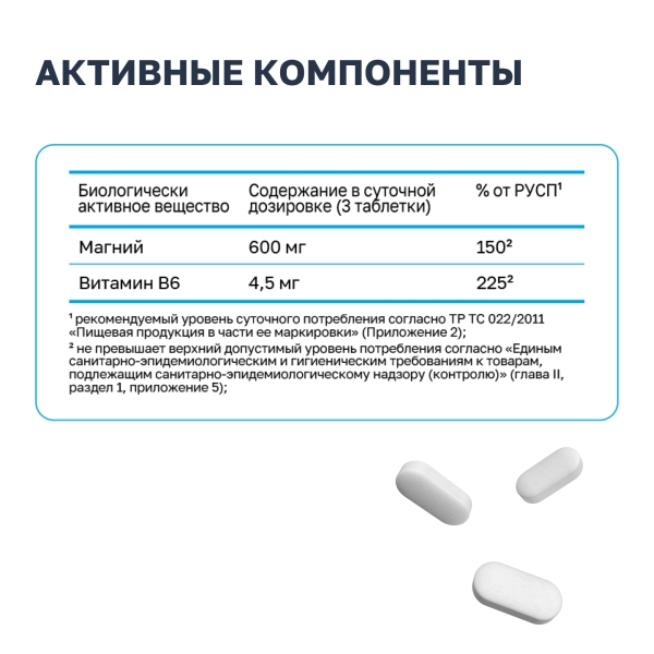 Магния глицинат, целлюлоза микрокристаллическая (носитель), оболочка таблетки (полиэтиленгликоль (стабилизатор), кальция карбонат (краситель), полиэтиленгликоль (глазирователь), тальк (агент антислеживающий)), крахмал ацетилированный (загуститель), кроскарамеллоза (стабилизатор), крахмал, обработанный щелочью (натрия гликолят крахмала) (стабилизатор), магния стеарат (стабилизатор), диоксид кремния (агент антислеживающий), пиридоксина гидрохлорид (витамин В6).