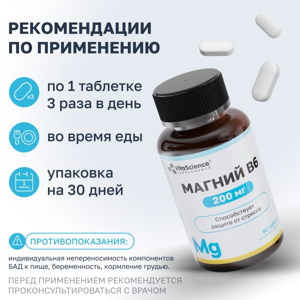 ✓ Подробная инструкция по применению Vitascience Магний B6 Форте таблетки 200мг+1,5мг, №90