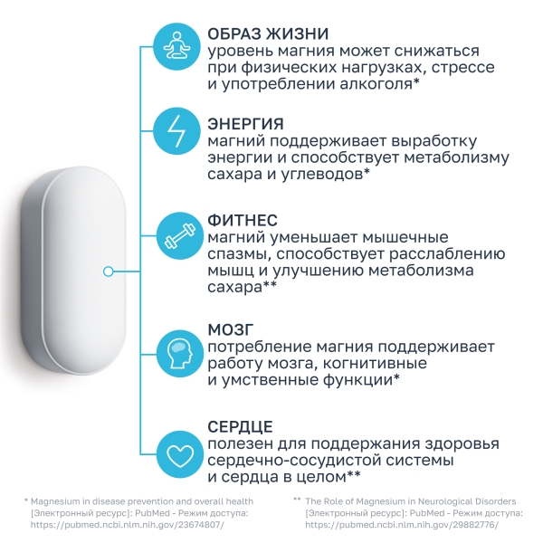Способствует укреплению нервной системы, улучшению сна, повышению устойчивости организма стрессам и профилактике дефицита магния в организме.