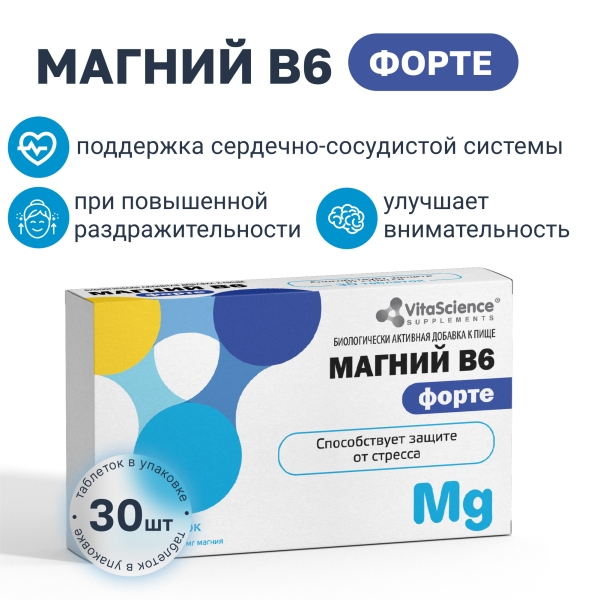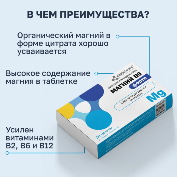 ✓ Купить Vitascience Магний B6 форте таблетки 100мг+1,74мг, №30 можно на сайте, в мобильном приложении и в аптеках Вита