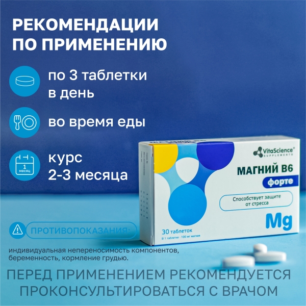 ✓ Подробная инструкция по применению Vitascience Магний B6 форте таблетки 100мг+1,74мг, №30