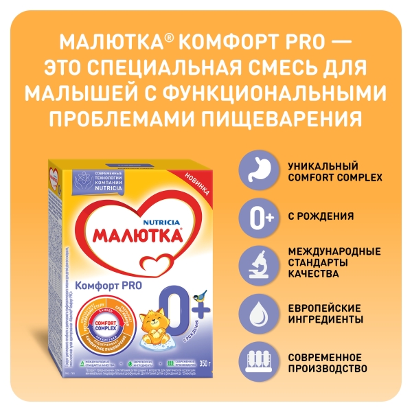 Мы объединили свой многолетний опыт и современные технологии компании Nutricia, чтобы создать уникальную формулу Малютка с ComfortComplex* для детей с проблемами пищеварения (срыгиваниями, запорами и связанными с ними коликами)