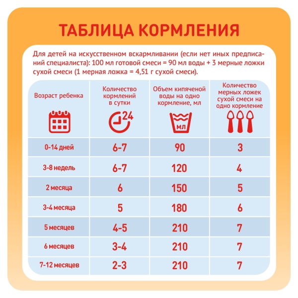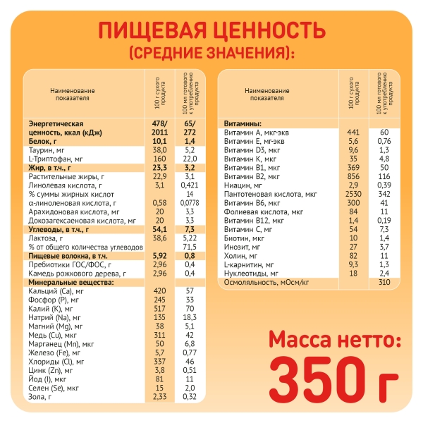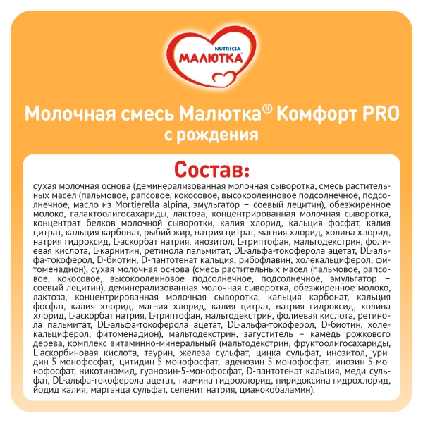 Сухая молочная основа (деминерализованная молочная сыворотка, смесь растительных масел (пальмовое, рапсовое, кокосовое, высокоолеиновое подсолнечное, подсолнечное, масло из Mortierella alpina, эмульгатор – соевый лецитин), обезжиренное молоко, галактоолигосахариды, лактоза, концентрированная молочная сыворотка, концентрат белков молочной сыворотки, калия хлорид, кальция фосфат, калия цитрат, кальция карбонат, рыбий жир, натрия цитрат, магния хлорид, холина хлорид, натрия гидроксид, L-аскорбат натрия, инозитол, L-триптофан, мальтодекстрин, фолиевая кислота, L-карнитин, ретинола пальмитат, DL-альфа-токоферола ацетат, DL-альфа-токоферол, D-биотин, D-пантотенат кальция, рибофлавин, холекальциферол, фитоменадион), сухая молочная основа (смесь растительных масел (пальмовое, рапсовое, кокосовое, высокоолеиновое подсолнечное, подсолнечное, эмульгатор – соевый лецитин), деминерализованная молочная сыворотка, обезжиренное молоко, лактоза, концентрированная молочная сыворотка, кальция карбонат, кальция фосфат, калия хлорид, магния хлорид, калия цитрат, натрия гидроксид, холина хлорид, L-аскорбат натрия, L-триптофан, мальтодекстрин, фолиевая кислота, ретинола пальмитат, DL-альфа-токоферола ацетат, DL-альфа-токоферол, D-биотин, холекальциферол, фитоменадион), мальтодекстрин, загуститель – камедь рожкового дерева, комплекс витаминно-минеральный (мальтодекстрин, фруктоолигосахариды, L-аскорбиновая кислота, таурин, железа сульфат, цинка сульфат, инозитол, уридин-5-монофосфат, цитидин-5-монофосфат, аденозин-5-монофосфат, инозин-5-монофосфат, никотинамид, гуанозин-5-монофосфат, D-пантотенат кальция, меди сульфат, DL-альфа-токоферола ацетат, тиамина гидрохлорид, пиридоксина гидрохлорид, йодид калия, марганца сульфат, селенит натрия, цианокобаламин).