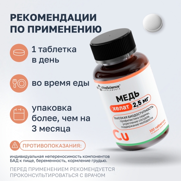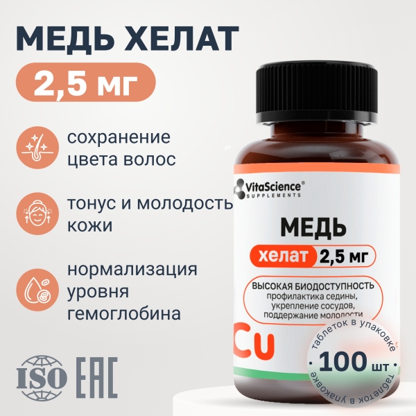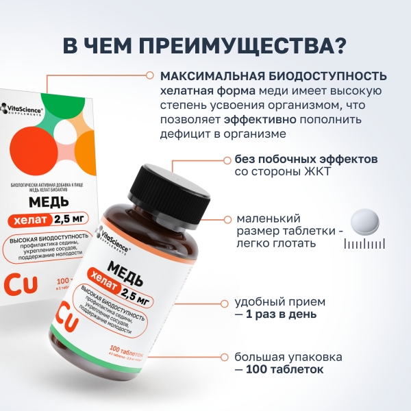 ✓ Купить Vitascience Медь хелат таблетки 2,5мг, №100 можно на сайте, в мобильном приложении и в аптеках Вита