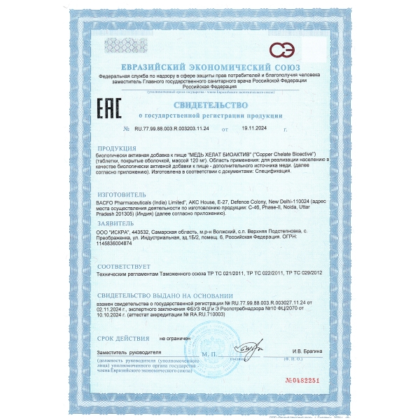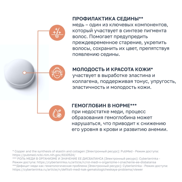 Целлюлоза микрокристаллическая (агент антислеживающий), меди бисглицинат, оболочка таблетки (гидроксипропилметилцеллюлоза (загуститель), диоксид титана (краситель), полиэтиленгликоль (стабилизатор), этилцеллюлоза (наполнитель), тальк (агент антислеживающий)), магниевая соль стеариновой кислоты (агент антислеживающий).