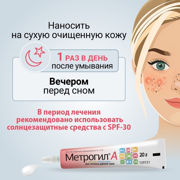 Во избежание раздражения кожи и снижения эффективности при применении препарата Метрогил® А необходимо свести к минимуму воздействие солнечного света и искусственного УФ облучения, включая лампы солнечного света. Если избежать воздействия не представляется возможным, рекомендуется применение солнцезащитных средств и одежды для защиты участков кожи, на которые был нанесен препарат.