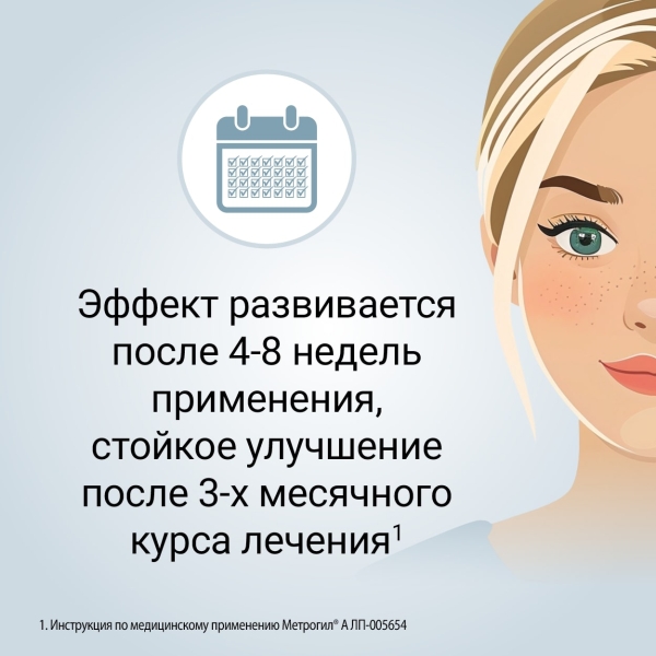 Максимальная концентрация метронидазола в плазме крови при наружном применении 1г геля на кожу лица составляет в среднем 32,9 нг/мл (диапазон 14,8 - 54,4 нг/мл) и достигается через 6-24 часа.