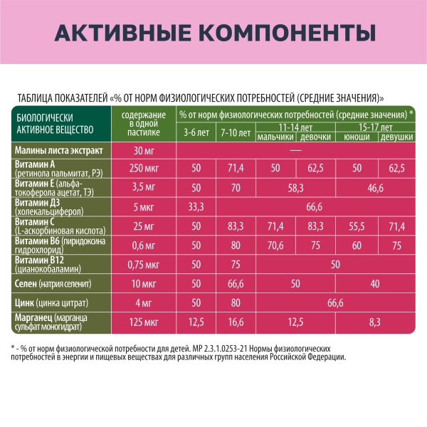 Сахар, патока мальтозная (стабилизатор), желатин пищевой говяжий, малины листа экстракт, L-аскорбиновая кислота, ретинола пальмитат, альфа-токоферола ацетат, холекальциферол, пиридоксина гидрохлорид, цианокобаламин, натрия селенит, цинка цитрат, марганца сульфат моногидрат, лимонная кислота – регулятор кислотности, ароматизатор «Малина», краситель: экстракт черной моркови.