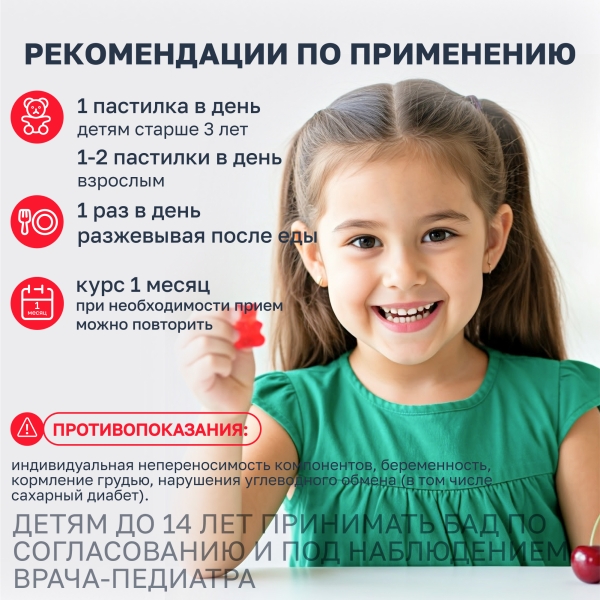 Детям старше 3-х лет и взрослым по 1 пастилке в день, разжевывая после еды. Продолжительность приема: 1 месяц.