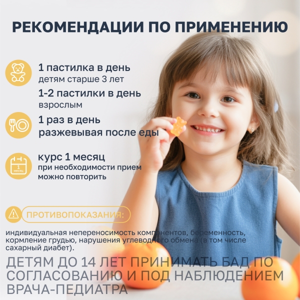 Детям старше 3-лет по 1 пастилке в день, взрослым по 1-2 пастилки в день, разжевывая после еды. Продолжительность приема: 1 месяц. При необходимости прием можно повторить.