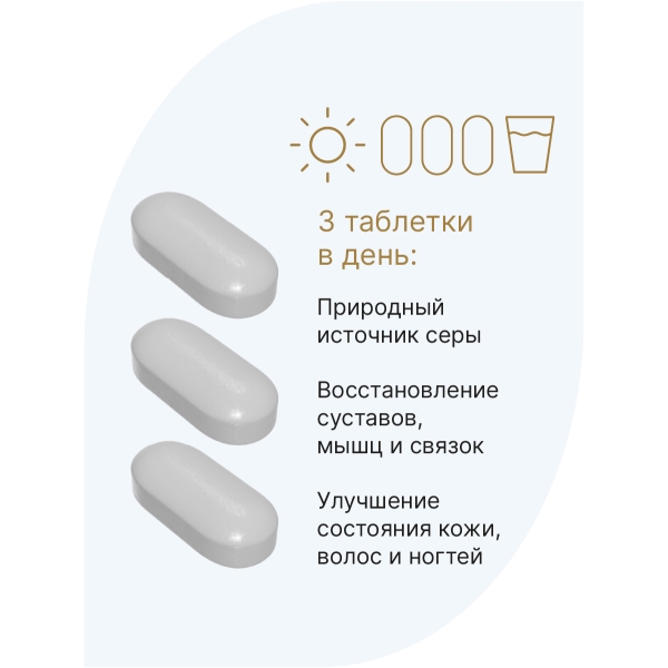 Метилсульфонилметан (МСМ); целлюлоза микрокристаллическая (носитель); диоксид кремния аморфный (агент антислеживающий); L-аскорбиновая кислота (витамин С); стеарат магния (агент антислеживающий); кроскармеллоза натрия (носитель); компоненты пленочного покрытия: гидроксипропилметилцеллюлоза (загуститель); полиэтиленгликоль (глазирователь).