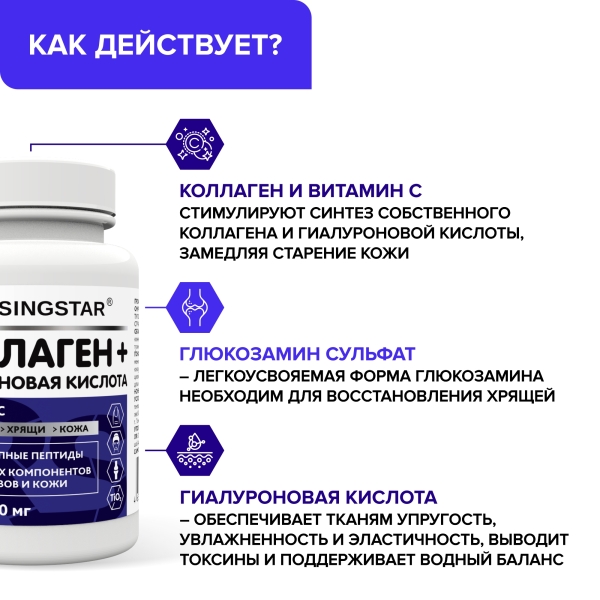 Коллаген гидролизованный, мумиё алтайское, глюкозамина сульфат, витамин С (аскорбиновая кислота), натрия гиалуронат, дигидрокверцетин, березовый экстракт. Вспомогательные вещества: целлюлоза микрокристаллическая (носитель), капсула желатиновая (желатин, глицерин), антислеживатели: кальция стеарат, кремния диоксид.
