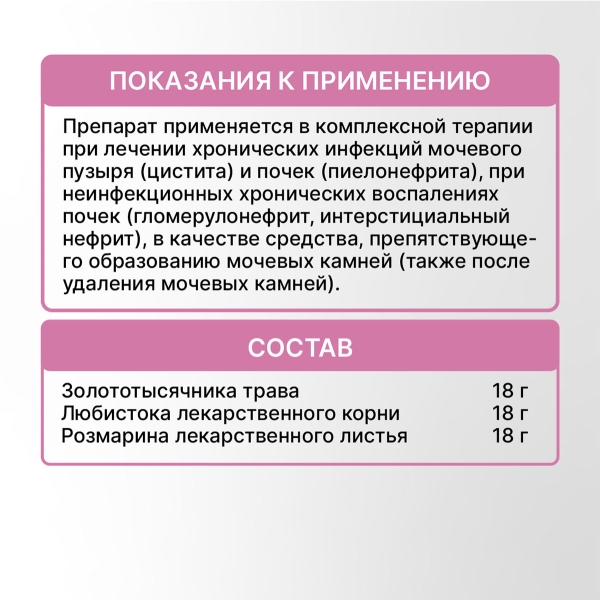 Препарат применяется в комплексной терапии при лечении хронических инфекций мочевого пузыря (цистита) и почек (пиелонефрита), при неинфекционных хронических воспалениях почек (гломерулонефрит, интерстициальный нефрит), в качестве средства, препятствующего образованию мочевых камней (также после удаления мочевых камней).
