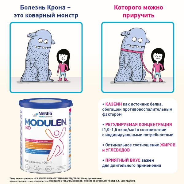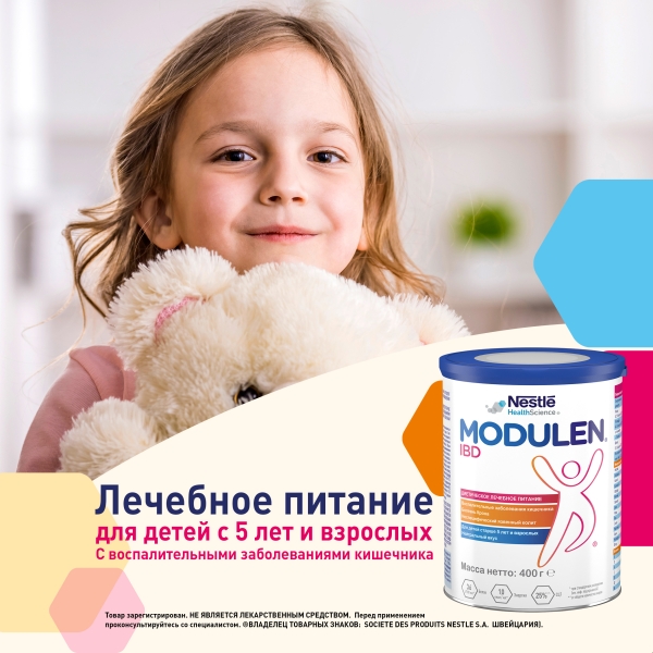 Modulen®IBD представляет собой уникальную порошкообразную смесь на основе цельного белка для диетического лечения болезни Крона в активной фазе, которая может использоваться в качестве единственного источника питательных веществ и для нутритивной поддержки пациентов с болезнью Крона в фазу ремиссии. Данная смесь содержит в качестве белкового компонента казеин, имеет оптимальный уровень липидов и углеводов и низкую осмоляльность, что повышает ее переносимость и улучшает вкусовые качества. Согласно результатам многочисленных клинических исследований, Modulen®IBD уменьшает воспалительные изменения в кишечнике и ускоряет заживление слизистой оболочки кишечника. Благодаря нейтральному вкусу смесь может использоваться в качестве напитка или для зондового питания.
