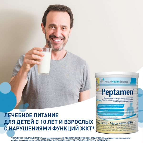 Смесь Peptamen® специализированное питание для детей с 10 лет и взрослых, облегчит усвоение всех необходимых питательных веществ у пациентов с резко пониженной способностью всасывания, для ускоренного восстановления после перенесенных заболеваний с нарушенной функцией желудочно-кишечного тракта. Peptamen® — сухая лечебная смесь для специализированного питания на основе гидролизованного белка молочной сыворотки. Уникальный высокотехнологичный продукт для детей от 10 лет и взрослых. Рекомендован в послеоперационные периоды или же пациентам с нарушениям работы ЖКТ и пониженной способностью всасывания питательных веществ. Благодаря формату в виде сухой смеси позволяет регулировать поступление энергии в организм. Расщепленному белку характерен горьковатый привкус. Эта естественная особенность обусловлена процессом обработки белка.
