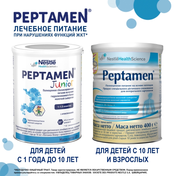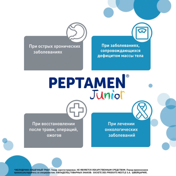 - Peptamen® Junior восполняет дефицит белка и энергии: быстрое поступление биологически ценного гидролизованного сывороточного белка, жиров и углеводов обеспечивает прилив сил у ребенка.