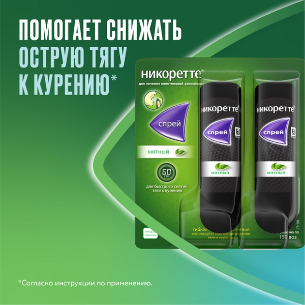 Спрей Никоретте® облегчает и (или) предотвращает тягу к курению сигарет и систем нагревания табака и симптомы «отмены», возникающие при табачной зависимости.
