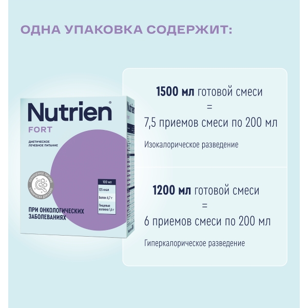 Nurtien Fort – это лечебная гиперкалорийная смесь для людей с онкологическими заболеваниями, в том числе в пред- и послеоперационный периодах, в ходе проведения противоопухолевой химио- и лучевой терапии, при наличии кахексии или нарушений питательного статуса различной степени тяжести.