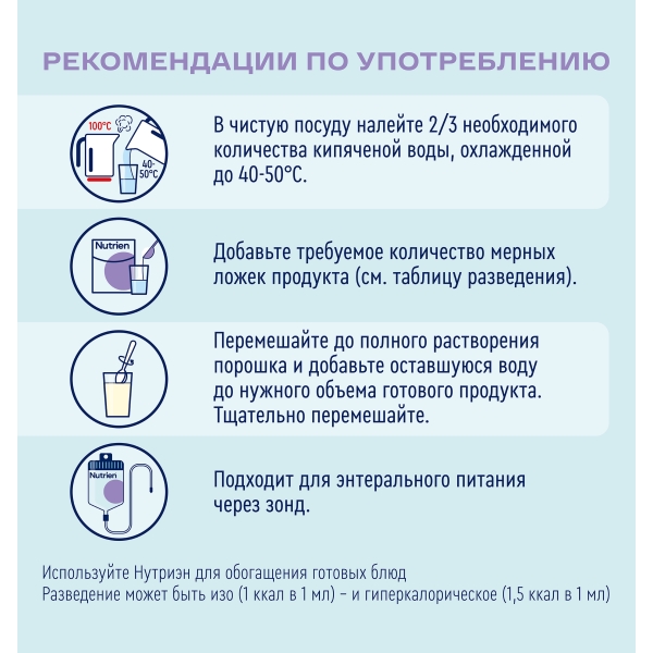 Nurtien Fort подходит для энтерального питания с помощью зонда или гастростомы. Также из смеси легко приготовить напиток, который человек может пить самостоятельно.