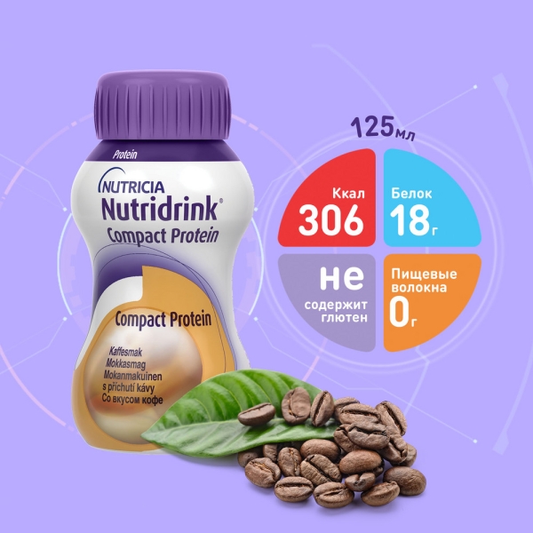 Специализированный пищевой продукт диетического лечебного питания, жидкая, готовая к употреблению, высокобелковая, высококалорийная смесь «Нутридринк Компакт Протеин» со вкусом кофе — это cбалансированный по составу продукт для энтерального питания взрослых пациентов (старше 18 лет) с недостаточностью питания или риском ее развития.