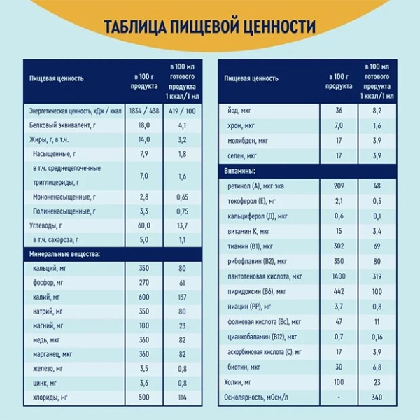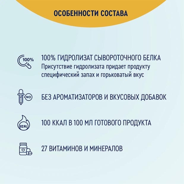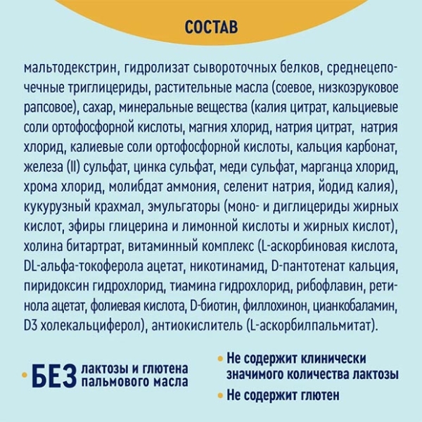 Мальтодекстрин, гидролизат сывороточных белков, среднецепочечные триглицериды, растительные масла (соевое, низкоэруковое рапсовое), сахар, минеральные вещества (кальциевые соли ортофосфорной кислоты, магния хлорид, натрия хлорид, калия цитрат, калиевые соли ортофорсфорной кислоты, натрия цитрат, кальция карбонат, железа (II) сульфат, цинка сульфат, меди сульфат, марганца хлорид, йодид калия, селенит натрия, хрома хлорид, молибдат аммония), эмульгаторы (моно- и диглицериды жирных кислот, эфиры глицерина и лимонной кислоты и жирных кислот), холин битартрат, витаминный комплекс (L-аскорбиновая кислота, DL-альфа-токоферола ацетат, никотинамид, D-пантотенат кальция, пиридоксин гидрохлорид, тиамина гидрохлорид, рибофлавин, ретинола ацетат, фолиевая кислота, D-биотин, филлохинон, цианкобаламин, D3 холекальциферол), антиокислитель (L-аскорбилпальмитат).