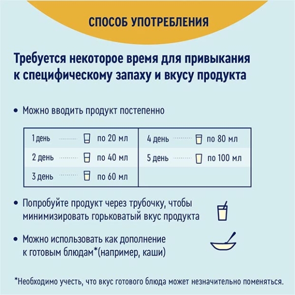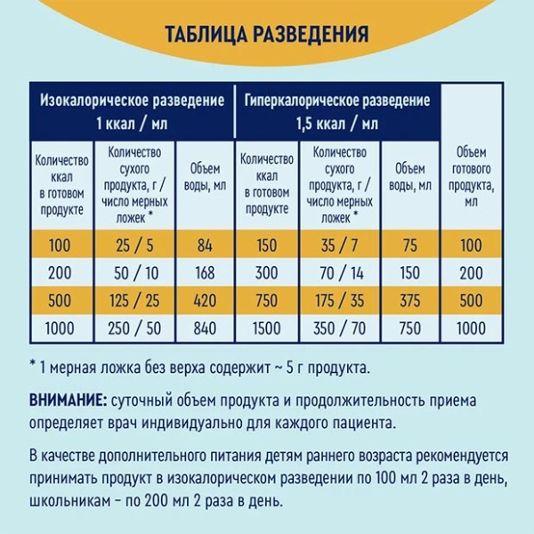 В качестве дополнительного питания употребляйте от 50 до 200 г в день (10-40 мерных ложен). Продукт готовьте непосредственно перед употреблением.