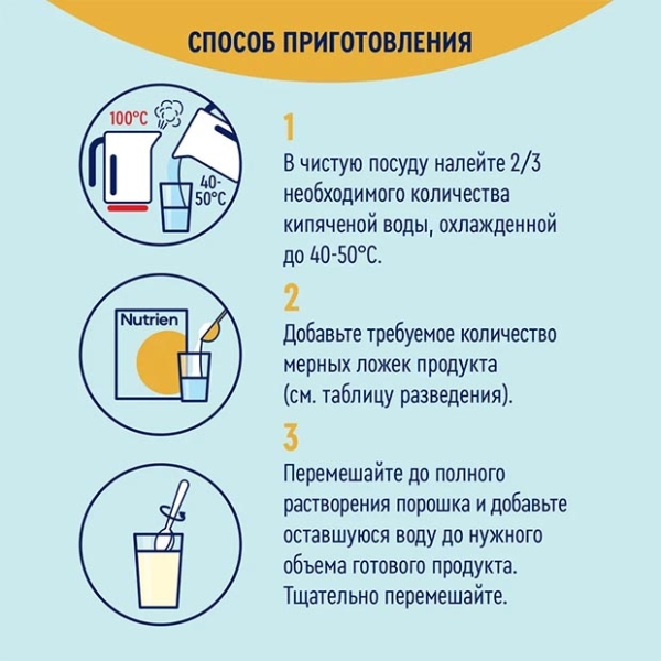Смесь, готовую к употреблению, можно хранить при комнатной температуре в течение 6 часов, а можно закрыть и поставить в холодильник, но только на 24 часа. Перед употреблением её нужно тщательно перемешать и подогреть до 30-36С.