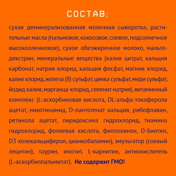 Сухая деминерализованная молочная сыворотка, растительные масла (пальмовое, кокосовое, соевое, подсолнечное высокоолеиновое), сухое обезжиренное молоко, мальтодекстрин, минеральные вещества (цитрат калия, карбонат кальция, хлорид натрия, фосфат кальция, хлорид магния, хлорид калия, железа(II)сульфат, сульфат цинка, сульфат меди, йодид калия, хлорид марганца, селенит натрия), витаминный комплекс (L-аскорбиновая кислота, DL-альфа-токоферола ацетат, никотинамид, D-пантотенат кальция, рибофлавин, ретинола ацетат, пиридоксина гидрохлорид, тиамина гидрохлорид, фолиевая кислота, филлохинон, D-биотин, D3 холекальциферол, цианокобаламин), эмульгатор (соевый лецитин), таурин, инозит, L-карнитин, антиокислитель (L-аскорбилпальмитат). Не содержит ГМО